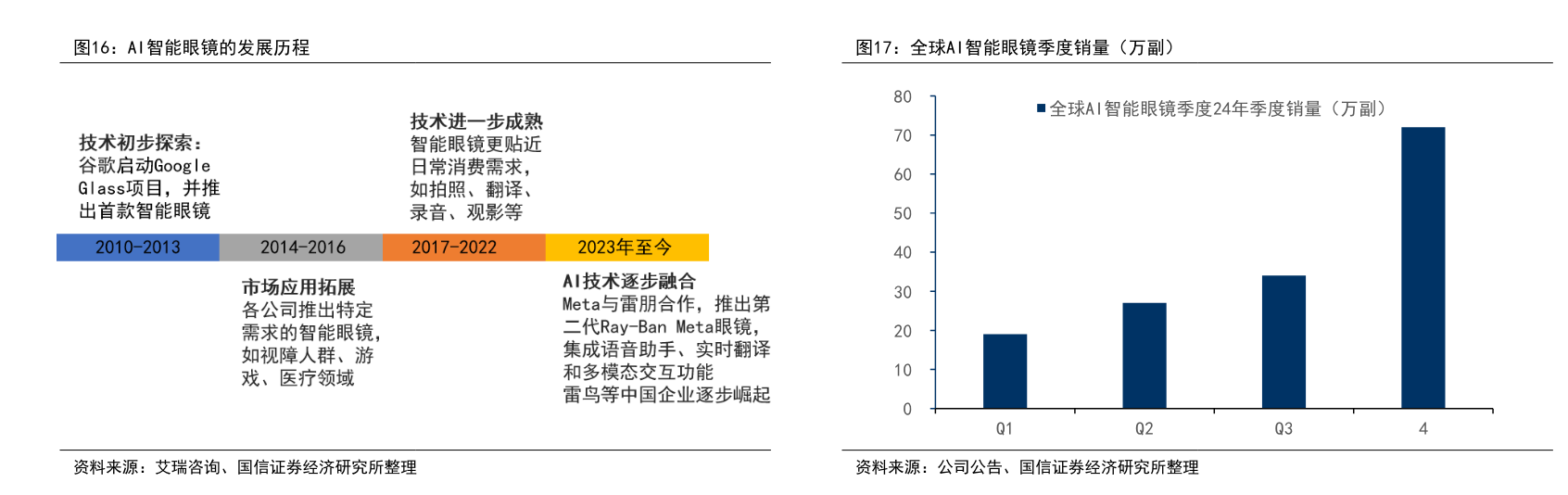 AI眼镜最早可以追溯至2008年立项的爱普生AR眼镜BT-100,2012年Google Project Glass将智能眼镜概念引入大众视野。十余年的发展时间,AI眼镜从小众产品升级为开始产生规模化产品需求的品类。据Wellsenn XR,2025年一季度,全球AI智能眼镜销量60万台,同比增长达216%,主要由Ray Ban Meta贡献。除了小米,下半年阿里、三星等十几个品牌也将发布新品,Meta预计将在三季度发布多款不同功能和形态的AI智能眼镜。