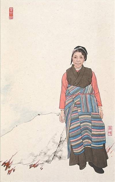 随后,创作团队开始勾线、层层晕染。为了充分发挥工写结合的艺术特点,通过肌理效果等强化厚重感,我们选用韧性较强的粗皮纸为媒材。在浅赭底色的粗皮纸上,画家们以提按起伏、粗细相间、疏密有致的线条,沉着有力的行笔,薄而不透、厚而不腻的分染、罩染,浓淡相宜的墨色、冷暖相间的设色,精心刻画人物的形神,并营造出空间感。最终,画面既有工笔重彩的精微刻画,又有水墨写意的松动与概括,充分体现出中国画用线、用色的美感与表现力。
