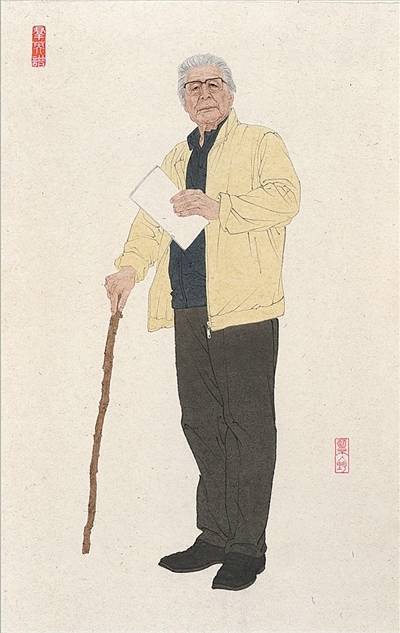 主创成员中,徐展、武欣、杨可、张美中、周乐等,都是具有丰富创作经验的人物画家。为了统一画风、牢牢抓住人物塑造这个重心,先由我和徐展构思、统筹每个人物的动作、形态等。对于工笔画而言,线描稿相当于支撑整个创作的骨架。在全身像的塑造中,单纯的线造型比注重明暗、体积的团块造型更具难度,且人物的动作和服装在整体艺术效果中所占的比重,甚至比眉目刻画的比重更大。主创成员没有条件与每一位“七一勋章”获得者面对面交流,无法通过现场写生观察、记录人物的形体特征、精神气质。可供参考的资料图片中,人物的全身像也不多见。为了使作品立得住、人物立得住,徐展凭借深厚的人物画功底,以“眼如触手笔如刀”的手法,从诸多资料图片中整合人物形象、刻画形体,每个人物线描都几易其稿。